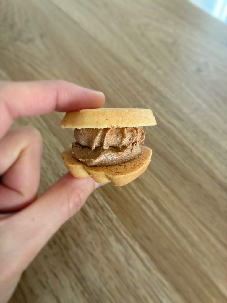 手の形をしたクッキーに、キャラメリゼされたくるみと、ほろ苦いキャラメルクリームがサンドされています。