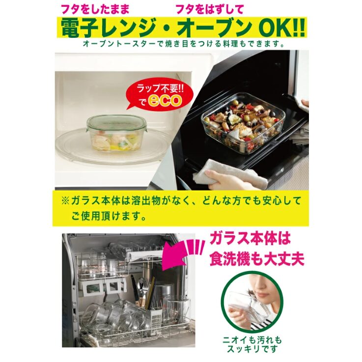 ガラス本体は電子レンジ・オーブンOK、フタは耐熱温度140℃まで対応 。