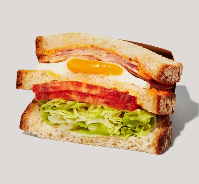 特徴石窯で焼き上げた香り豊かな3枚のカンパーニュに挟むのは、グリルベーコン・卵・トマト・レタス。